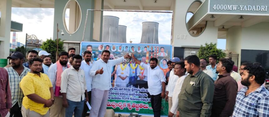 దామరచర్ల, ఆగస్టు 21,(ప్రజా జ్యోతి):దామరచర్ల మండలం వీర్లపాలెం వద్ద తెలంగాణ ప్రభుత్వం ప్రతిష్టాత్మకంగా నిర్మించిన యాదాద్రి థర్మల్ పవర్ ప్లాంట్ ప్రాజెక్ట్ నిర్మాణంలో భూములు కోల్పోయిన భూ నిర్వాసితులకు ఇచ్చిన మాట ప్రకారం రాష్ట్ర ప్రభుత్వం ఉద్యోగాలు కల్పించిన సందర్భంగా మిర్యాలగూడ ఎమ్మెల్యే బత్తుల లక్ష్మారెడ్డికి ప్రత్యేక కృతజ్ఞతలు తెలియచేస్తూ సీఎం రేవంత్ రెడ్డి,డిప్యూటీ సీఎం బట్టి విక్రమార్క,మంత్రులు,ఎమ్మెల్యే, ఎమ్మెల్సీ ల చిత్రపటానికి పవర్ ప్లాంట్ ఎదుట పాలాభిషేకం చేశారు.అనంతరం బాణసంచా కాల్చి..స్వీట్లు పంచుకొని సంబరాలు జరుపుకున్నారు. ఈ సందర్భంగా వారు మాట్లాడుతూ..పవర్ ప్రాజెక్టు కోసం భూములను ఇచ్చి సర్వం కోల్పోయిన 335 మంది భూ నిర్వాసితులకు ఉద్యోగాలు ఇచ్చి రాష్ట్ర ప్రభుత్వంఆదుకుందన్నారు.తమకు ఇచ్చిన హామీ మేరకు గత ప్రభుత్వం ఉద్యోగాలుకల్పించలేదన్నారు.ఆ హామీని నెరవేర్చేల అహర్నిశలు కృషిచేసిన స్థానిక ఎమ్మెల్యే బత్తుల లక్ష్మారెడ్డికి ఈ సందర్భంగా ప్రత్యేక కృతజ్ఞతలు తెలియజేశారు.