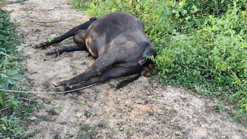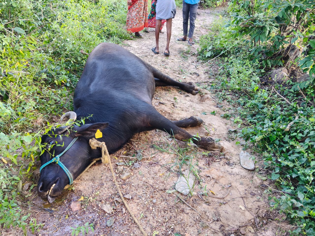 పర్వతగిరి మండలం దౌలత్ నగర్ గ్రామం కత్తుల వెంకటేశ్వర్లు కు సంబంధించిన పాలిచ్చే గేదెను రోజులాగే మేత కోసం వ్యవసాయ భూమి దగ్గరకు తీసుకెళ్లారు. మొంథ తుఫాన్ కారణంగా ఈదురు గాలులకు తెగిపడిన కరెంటు తీగలను నేటికి విద్యుత్ అధికారులు పట్టించుకోకుండా నిర్లక్ష్యంగా వ్యవహరించారు. దింతో మేతకు వెళ్లిన గేదె కిందపడిపోయిన కరెంటు తీగలకు తాకి మృతి చెందిందని బాధితుడు కత్తుల వెంకటేశ్వర్లు తెలిపారు. మృతి చెందిన గేదె దాదాపు లక్ష 20 వేల విలువగలదాని ఉదయం 5 లిటర్లు సాయంత్రం 5 లీటర్ల పాలిచ్చే ఏది మృతి చెందడంతో ఉపాధి కూలిపోయామని అన్నారు. వెంటనే విద్యుత్ అధికారులు చర్యలు తీసుకొని మాకు తగిన న్యాయం చేయాలని వేడుకున్నారు.