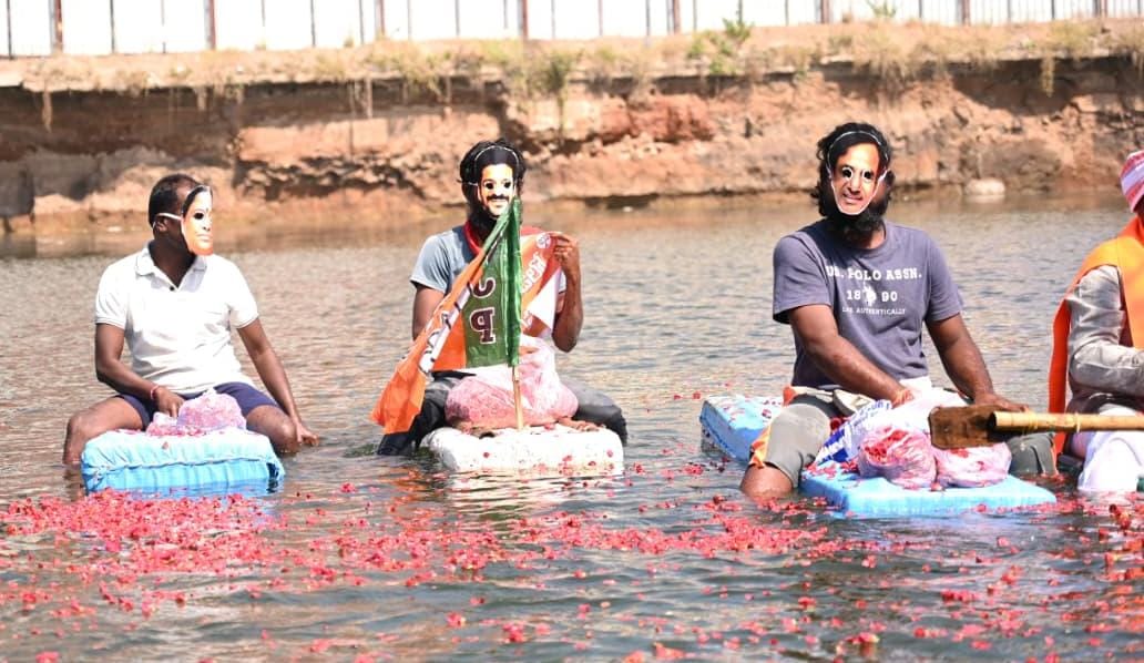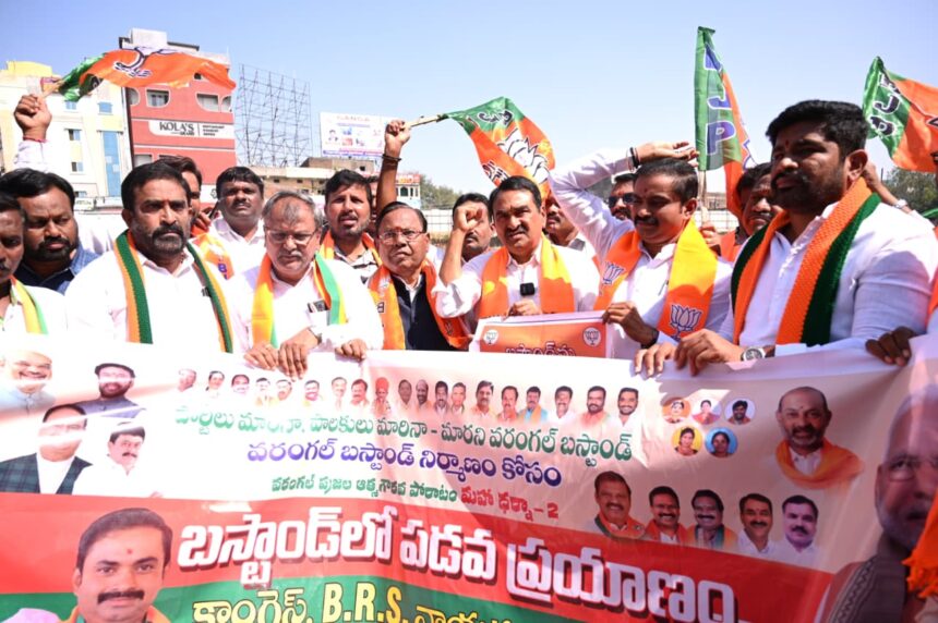 తెలంగాణలో హైదరాబాద్ తర్వాత రెండో రాజధానిగా పేరొందిన వరంగల్ జిల్లా కేంద్రానికి కనీసం బస్టాండ్ లేని పరిస్థితి నెలకొంది. ప్రస్తుతం ఉన్న బస్టాండ్ ను కూల్చి ఏళ్ళు గడుస్తున్న కనీసం ఒక్క ఇటుక కూడా పేర్చిన పరిస్థితి లేదు. అడుగు భాగంలో మట్టిని తోడి అలాగే వదిలేయడంతో పెద్ద స్విమ్మింగ్ పూల్ గా మారింది. దీనిపై వరంగల్ జిల్లా భారతీయ జనతా పార్టీ జిల్లా అధ్యక్షుడు గంట రవికుమార్, రాష్ట్ర నాయకులు, వరంగల్ అర్బన్ కోఆపరేటివ్ బ్యాంక్ చైర్మన్ ఎర్రబెల్లి ప్రదీప్ రావు ఆధ్వర్యంలో గురువారం బస్టాండు వద్ద నిరసన కార్యక్రమం చేపట్టారు. స్విమ్మింగ్ బోట్స్ తెప్పించి ముఖ్యమంత్రి రేవంత్ రెడ్డి, స్థానిక మంత్రి కొండా సురేఖ, మాజీ ముఖ్యమంత్రి కెసిఆర్ ముఖాలతో ఉన్న మాస్కులు ధరించి వారిని ఆ నీళ్లలో బోట్ షికారు చేయించారు. వరంగల్ వాసులకు పడవ ప్రయాణం కల్పించిన మంత్రి సురేఖకు ధన్యవాదాలు అంటూ పూలు జల్లి నిరసన తెలిపారు. నిత్యం ప్రజలు బస్టాండ్ సౌకర్యం లేక ఇబ్బందులు ఎదుర్కొంటున్న వారికి రాజకీయాలపై ఉన్న శ్రద్ధ ప్రజా సమస్యలపై లేదని దుయ్యబట్టారు. వెంటనే బస్టాండ్ పనులు ప్రారంభించి తొందరగా నిర్మాణం పూర్తి చేయాలని డిమాండ్ చేశారు. ఈ కార్యక్రమంలో బిజెపి రాష్ట్ర కార్యవర్గ సభ్యులు కుసుమ సతీష్, రత్నం సతీష్, మాజీ ఎమ్మెల్యే వన్నాల శ్రీరాములు, రాష్ట్ర నాయకులు కంభంపాటి పుల్లారావు, జిల్లా ప్రధాన కార్యదర్శిలు బాకం హరిశంకర్, మల్లాడి తిరుపతిరెడ్డి, గోగుల రాణా ప్రతాప్ రెడ్డి, జలగం రంజిత్ రావు, మాజీ జడ్పీ వైస్ చైర్మన్ గజ్జెల శ్రీరాములు మరియు జిల్లా, మండల పదాధికారులు, వివిధ మోర్చా జిల్లా అధ్యక్షులు, నాయకులు, మహిళా మోర్చా కార్యకర్తలు తదితరులు పాల్గొన్నారు.