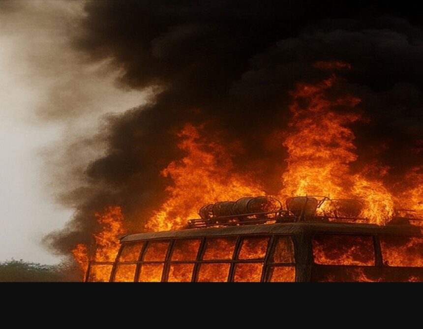 పోలీసుల వివరాల ప్రకారం శనివారం సాయంత్రం 5:15 గంటల సమయంలో ఓ స్లీపర్ బస్సు పెళ్లి బృందాన్ని ఎక్కించుకునేందుకు సమోనా గ్రామానికి బయలుదేరింది. మార్గమధ్యంలో కిందకు వేలాడుతున్న హైటెన్షన్ విద్యుత్ తీగను డ్రైవర్ అంచనా వేయలేకపోయాడు. దీంతో బస్సు పైభాగం వైర్కు తగలడంతో ఒక్కసారిగా విద్యుత్ ప్రసరించి మంటలు చెలరేగాయి. క్షణాల్లోనే బస్సు మొత్తం అగ్నికి ఆహుతైంది.