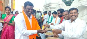 భక్తులకు ప్రసాదం అందచేస్తున్న నిర్వాకులు