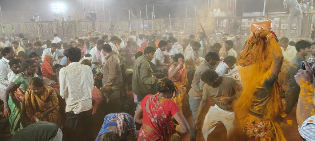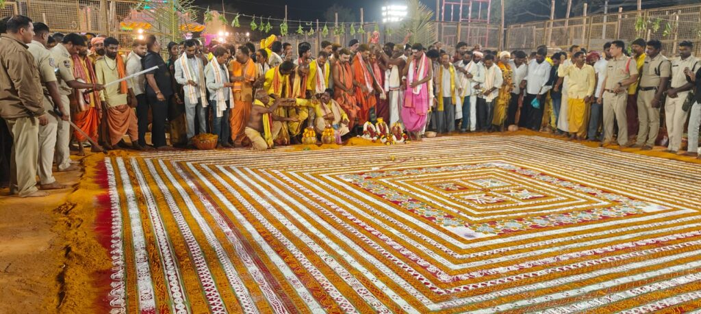 చేర్యాల (కొమురవెల్లి)ఫిబ్రవరి16 (ప్రజాజ్యోతి):తెలంగాణ రాష్ట్రంలోని ప్రముఖ శైవ క్షేత్రమైన కొమురవెల్లి మల్లికార్జున స్వామి జాతర బ్రహ్మోత్సవాల్లో భాగంగా మహా శివరాత్రి సందర్భంగా ఆలయ తోటబావి వద్ద పెద్ద పట్నం కార్యక్రమాన్ని వైభవంగా నిర్వహించారు ఆలయ అధికారులు. పంచ రంగులతో 42 వరుసలతో పెద్ద పట్నాన్ని సర్వాంగ సుందరంగా తీర్చిదిద్దారు ఆలయ ఒగ్గు పూజారులు. లింగోద్భవ కాలంలో స్వామివారి గర్భాలయంలో మహాన్యాస పూర్వక ఏకాదశ రుద్రాభిషేకం ఆలయ అర్చకులు నిర్వహించారు.అర్ధరాత్రి సమయంలో ఆలయ తోటబావి వద్ద స్థానిక ఒగ్గు పూజారులు మూడు గంటలకు పైగా అత్యంత భక్తి శ్రద్ధలతో మల్లన్నకు పంచ రంగులతో 42 వరుసలతో పెద్ద పట్నాన్ని రచించి పట్నం మధ్యలో నిమ్మకాయలతో చిత్ర కన్ను నెలకొల్పి సర్వాంగ సుందరంగా తీర్చి దిద్దారు.పట్నానికి అష్ట దిక్కుల నిమ్మకాయలు, గుమ్మడి కాయలతో బలిహరణ చేసి పట్నం పైకి ఆవహానం చేస్తారు. ఒగ్గు పూజారులు బోనాలు సమర్పించిన అనంతరం వీరశైవ అర్చకులు గర్భాలయం నుండి స్వామివారి ఉత్సవ విగ్రహాలను ఊరేగింపుగా తీసుకొని వచ్చి పసుపుతో ప్రత్యేక పూజలు నిర్వహించిన అనంతరం ఉత్సవ విగ్రహాలతో పట్నాన్ని దాటారు.అనంతరం పెద్ద పట్నాన్ని తిలకించేందుకు భారీ సంఖ్యలో వచ్చిన భక్తులు, శివసత్తులు పట్నాన్ని తొక్కుతూ తన్మయత్వం పొందారు. దీంతో ఒక్కసారిగా ఆలయ పరిసరాలు మల్లన్న నామస్మరణతో మార్మోగాయి.కోరమీసాల కొమురవెల్లి మల్లన్న పెద్ద పట్నం కార్యక్రమం భక్తుల కోలాహలం మధ్య అత్యంత వైభవంగా జరిగింది. వేలాదిగా తరలివచ్చిన భక్తులు, శివసత్తులు పెద్ద పట్నం తొక్కేందుకు పోటీపడ్డారు.